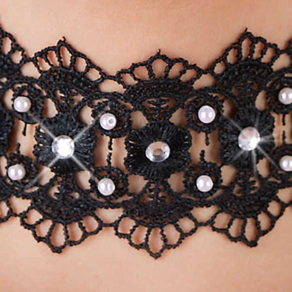Zwarte, geborduurde ketting met witte parels en strassteentjes. Met een satijnen strik om achter vast te knopen.