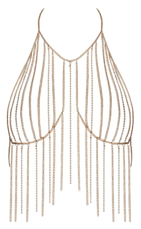 Goudkleurige kettingtop van Cottelli ACCESSOIRES, deels met strassteentjes. Glamoureus sieraad met individueel verstelbare karabijnsluiting in de nek en volledig open rug. Een stijlvol erotische look wanneer het naast de huid wordt gedragen. De oogverblindende kettinglook kan ook stijlvol gecombineerd worden met badmode of nauwsluitende outfits.