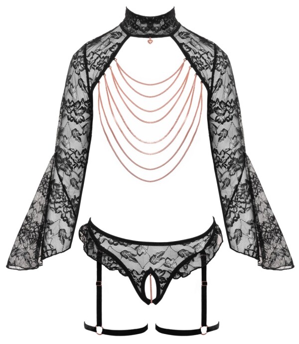 Spannende open set van Abierta Fina met een bustless bolero top en een kruisloze jarretelslip. Fijn zwart bloemenkant verleidelijk afgezet met fluwelen details en roségoudkleurige kettingen. Overal zacht en stretchy voor een hoog draagcomfort. Bolero-top met lange uitlopende mouwen. De opstaande kraag heeft een kleine hartvormige hanger aan de voorkant en een haaksluiting in de nek. Talrijke kettingen sieren de open voorkant en spelen rond de blote borsten. Alle kettingen kunnen ook worden verwijderd. De jarretelslip verleidt met delicate ruches op de hoge beenuitsnijdingen en een afneembare, stimulerende ketting in het uitnodigend open kruis. De elastische jarretelbandjes en dijbeenbandjes van fijn fluweel kunnen op maat worden versteld en zijn ook volledig afneembaar.
