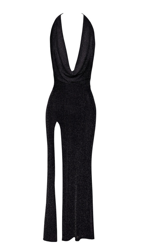 Ontwerp: Met een zachte, gedrapeerde collijn die om de nek wordt geknoopt, onthult de jurk elegant de schouders. Een open rug versierd met een sprankelend strass bandje trekt de aandacht, terwijl een diepe split aan de voorkant het been accentueert en een opvallend, vloeiend silhouet creëert.