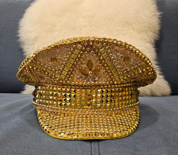 Leuke glamour militaire pet, bezaaid met goudkleurige pailletten, studs en stenen.