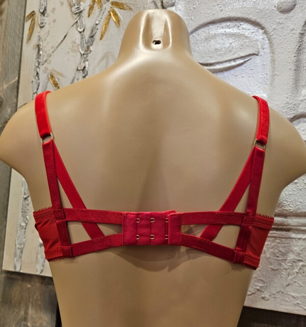 Prachtige kanten beugel BH met 3-traps sluiting op de rug. Voorop een mooi rood juweeltje.