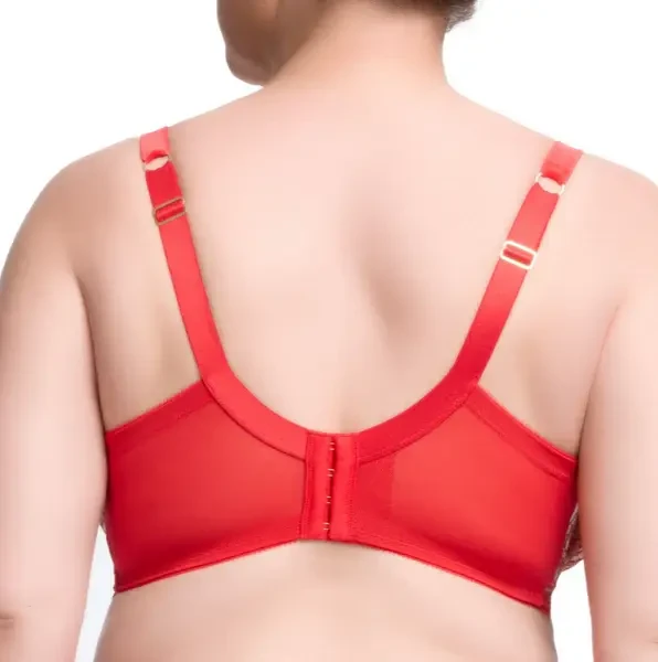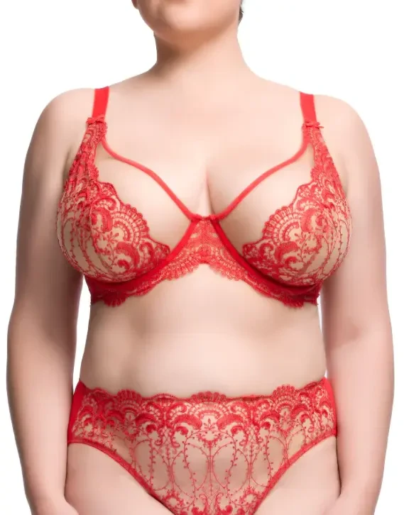Prachtige kanten BH voor de grotere cup. Deze BH is gemaakt van rood kant wat op huidskleurige mesh is geborduurd. Voorzien van een stevige beugel en aan de achterzijde een brede band met 3-haaks sluiting.