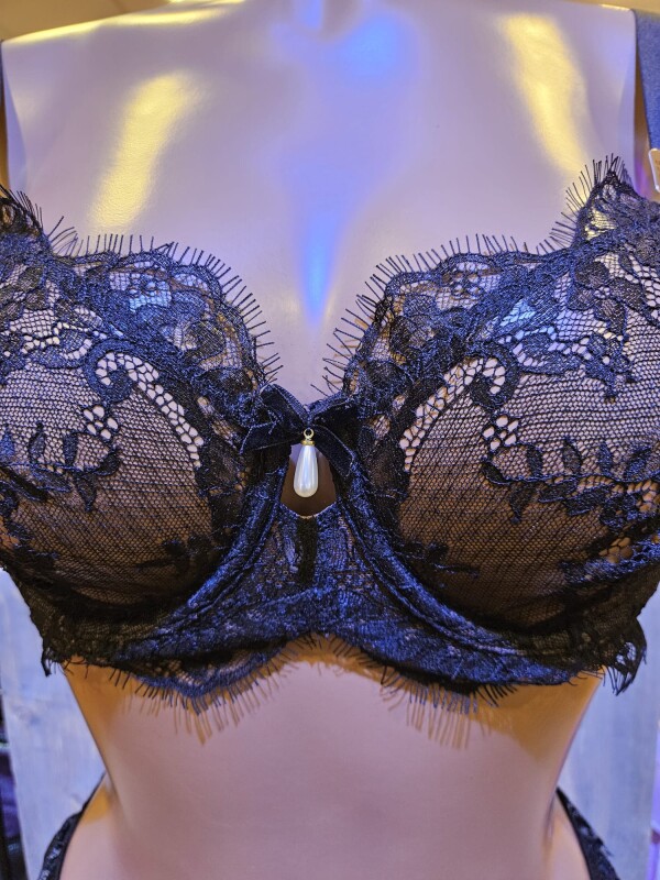 Mooie kanten BH met parelaccenten. Deze balconet BH heeft een beugel. Tussen de borsten een mooie druppelvormige parel, op de schouders een snoer met ronde pareletjes. De parelketting op de schouders is te verwijderen.