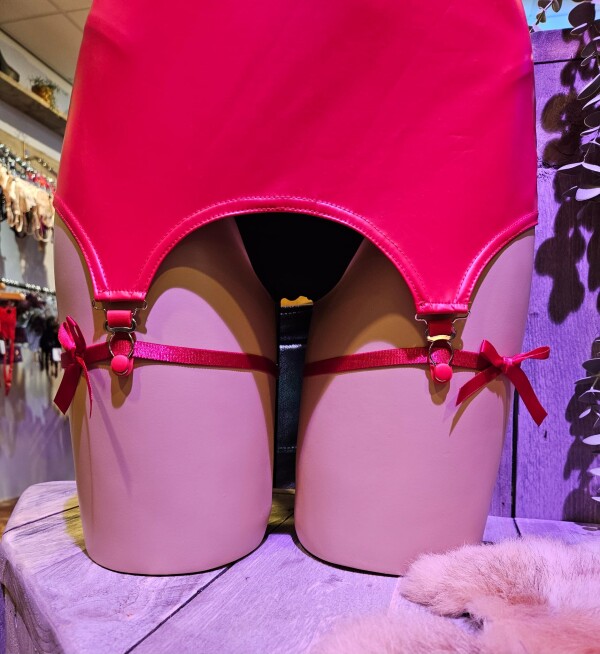 Set van 2 rode beenbandjes met strikje. De bandjes zijn gemaakt van elastisch materiaal en zijn voorzien van schuivertjes om de pasvorm goed te laten aansluiten.