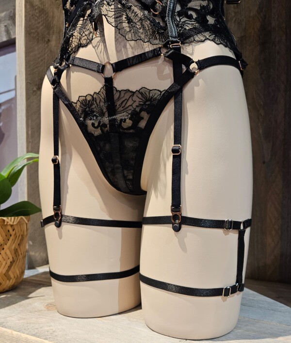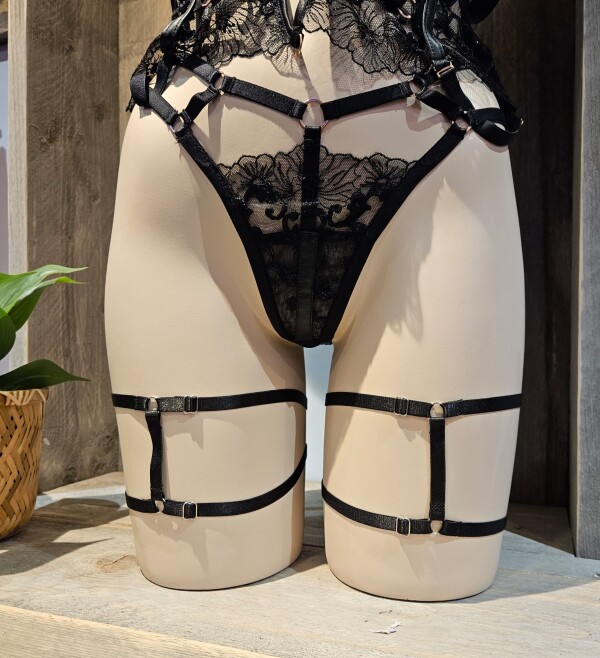 Leuke set dubbele beenbandjes , met schuivertjes verstelbaar. Draag deze bandjes om je outfit helemaal af te maken om beide benen. Ook zeer geschikt om te dragen met een jarretel gordel, als je eens geen kousen aan wil, maar wel je mooie jarretel gordeltje.