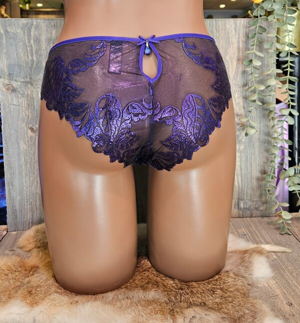 Prachtige brazilian slip in een spectaculaire kleur blauw-paars! Geborduurd met paars glanzend draad op een blauwe transparante ondergrond. Fantastisch in combinatie met de bijpassende jarretelgordel en beugel BH!