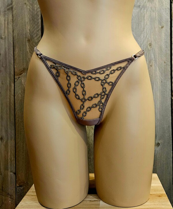 Prachtige string in een mooie transparante bronze-kakhi kleur met delicaat borduurwerk in een sexy kettingenpatroonVerfraaid met gouden kettingen.