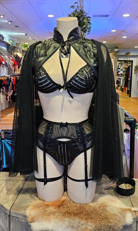 Spectaculair in combinatie met de bijpassende BH, jarretelgordel en bolero!