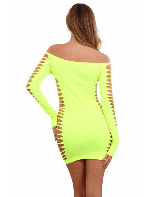Superleuk neongeel jurkje gemaakt van zacht elastisch materiaal. Met lange mouwen, een wijde hals en sexy uitsnedes op de heupen en borst.