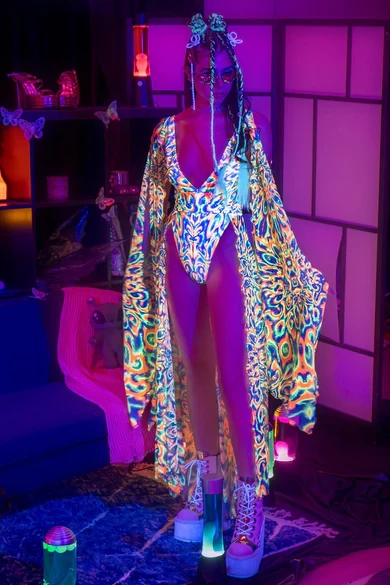 Licht transparante mesh rok in de kleuren groen, geel, blauw en oranje met elastische tailleband, een eyecatcher op elk festival. Pak je shine in neon en blacklight.